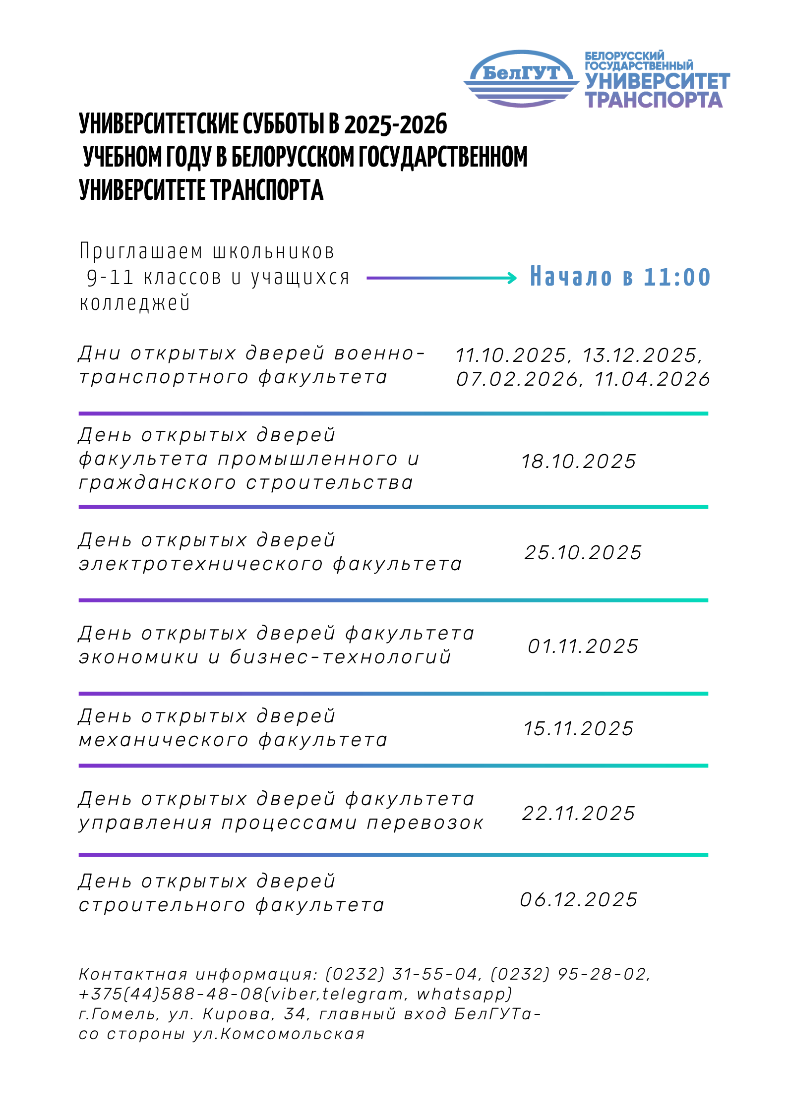 Адрес: г. Гомель, ул. Кирова, главный вход БелГУТа - со стороны ул. Красноармейская
